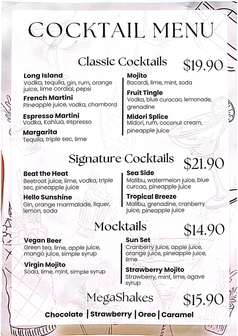 - Salads: The Chicken Caesar Salad is a classic delight, featuring croutons, pancetta, and a poached egg, while the Chef’s Salad dazzles with chargrilled chicken and prawns.