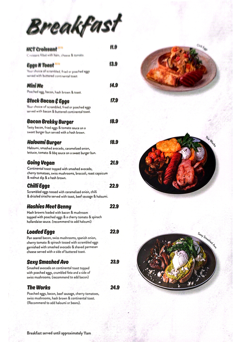 Continental toast topped with smashed avocado, hash browns, cherry tomatoes, baked beans, swiss mushrooms & broccoli.