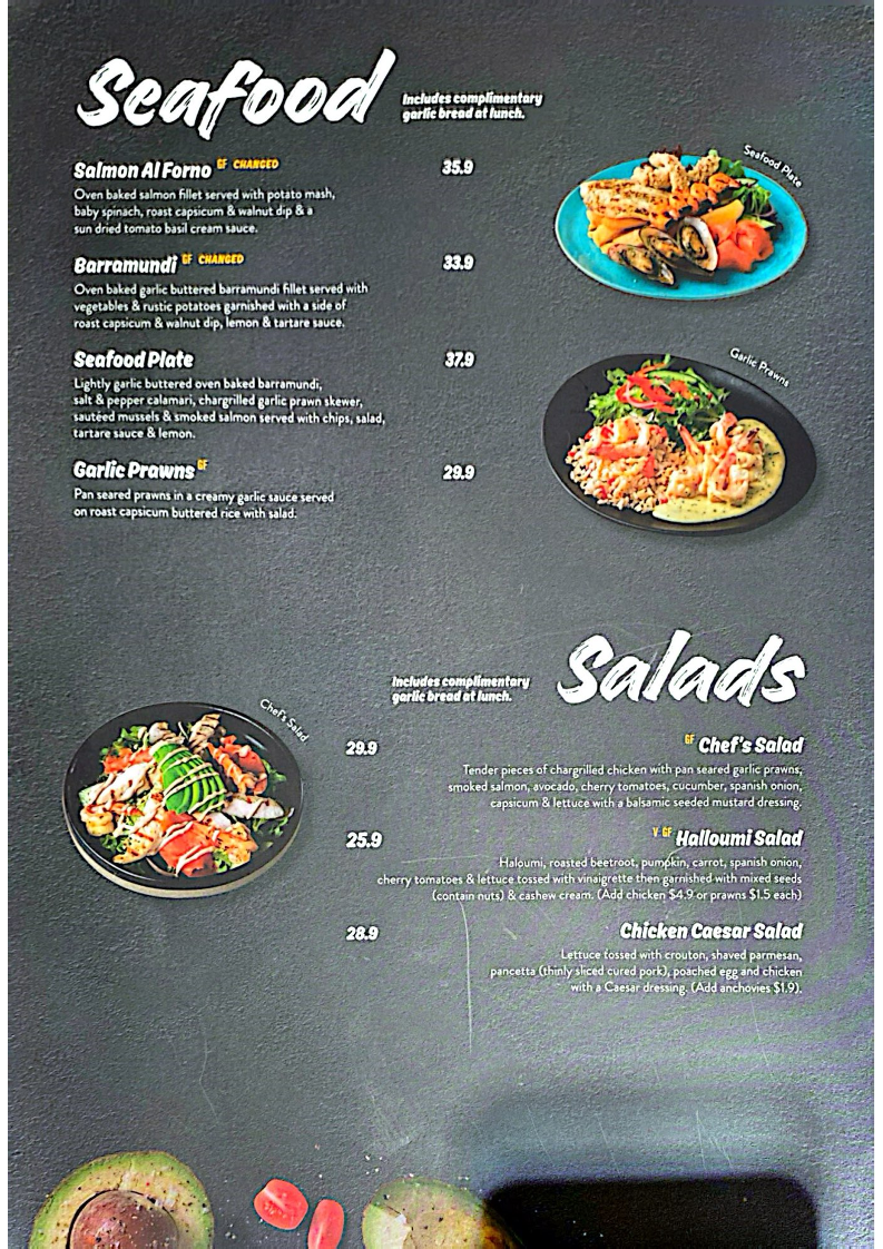 Lightly garlic buttered oven baked barramundi, salt & pepper calamari, chargrilled garlic prawn skewer, sautéed mussels & smoked salmon served with chips, salad, tartar sauce & lemon.